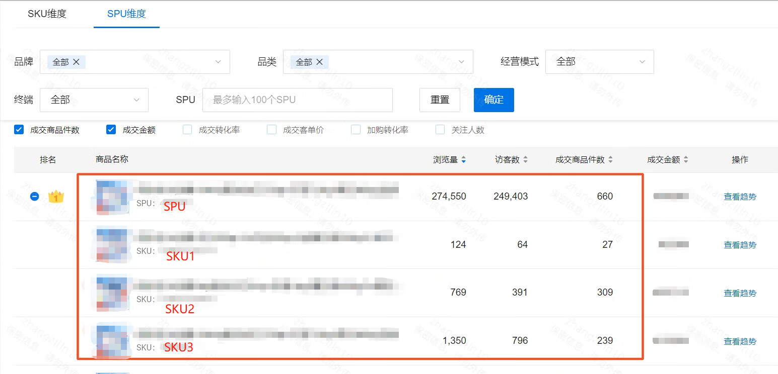 【商智品牌版(自营)】历史数据回溯前,SPU及下钻SKU均展示历史绑定SKU数据,新建SPU展示新SPU-SKU绑定关系及数据。历史数据回溯后,SPU展示新SPU-SKU绑定关系汇总数据。